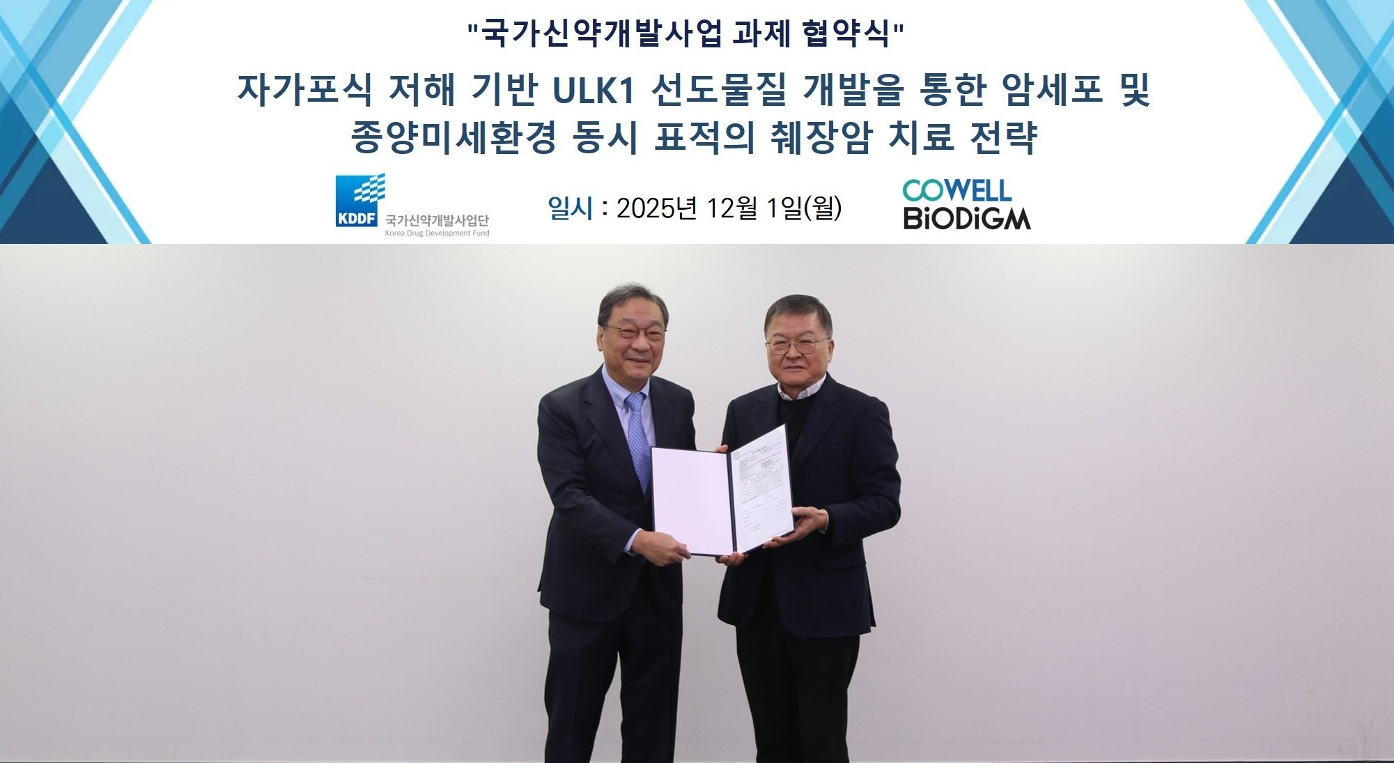 당사는 국가신약개발사업(KDDF)에「자가포식 저해 기반 ULK1 선도물질 개발을 통한 암세포 및 종양미세환경 동시 표적의 췌장암 치료 전략」 과제가 선정되었습니다.